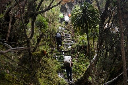 The trek out of basecamp and for the rest of the first day was a sustained uphill effort. The temperature hit 30 degrees as we hiked up steeply forested terrain, climbing up big boulders and slithering over ancient tree roots. Occasionally a wooden ladder would appear to assist our ascent. A waterfall of sweat was pouring down my back. As I stopped for a break, I was mindful of the biting ants, which are highly skilled at crawling under your clothing and then letting you know they are there!